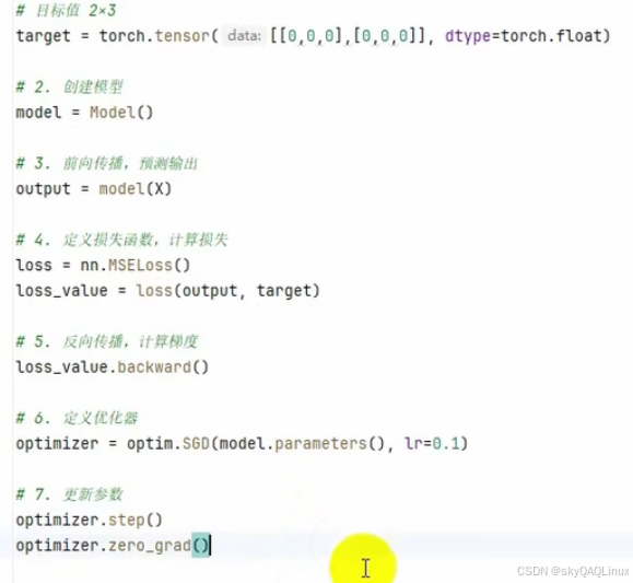 4.模型训练--->前向传播--->计算损失--->反向传播--->更新参数--->梯度清零