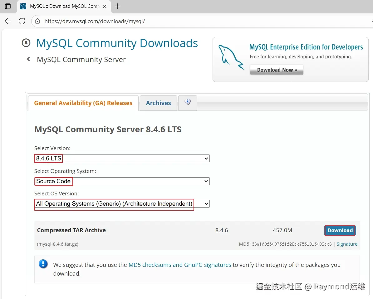 然后版本选择"8.4.6 LTS",操作系统选择"Source Code",系统版本选择"All Operating Systems (Generic) (Architecture Independent)",然后选择下面的"mysql-8.4.6.tar.gz"包后面的"Download"进行下载,如图91所示。