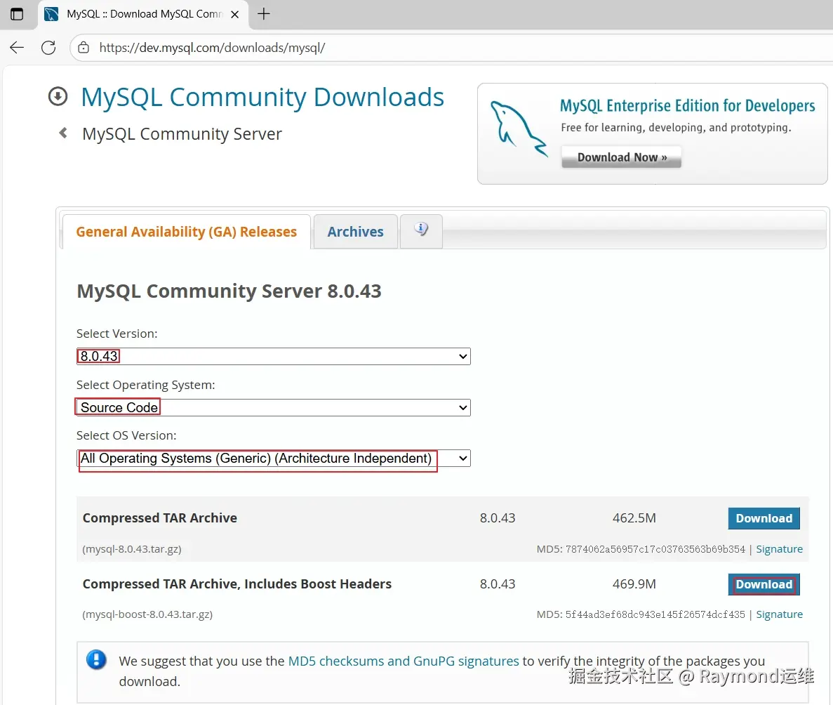 然后版本选择"8.0.43",操作系统选择"Source Code",系统版本选择"All Operating Systems (Generic) (Architecture Independent)",然后选择下面的"mysql-boost-8.0.43.tar.gz"包后面的"Download"进行下载,如图87所示。