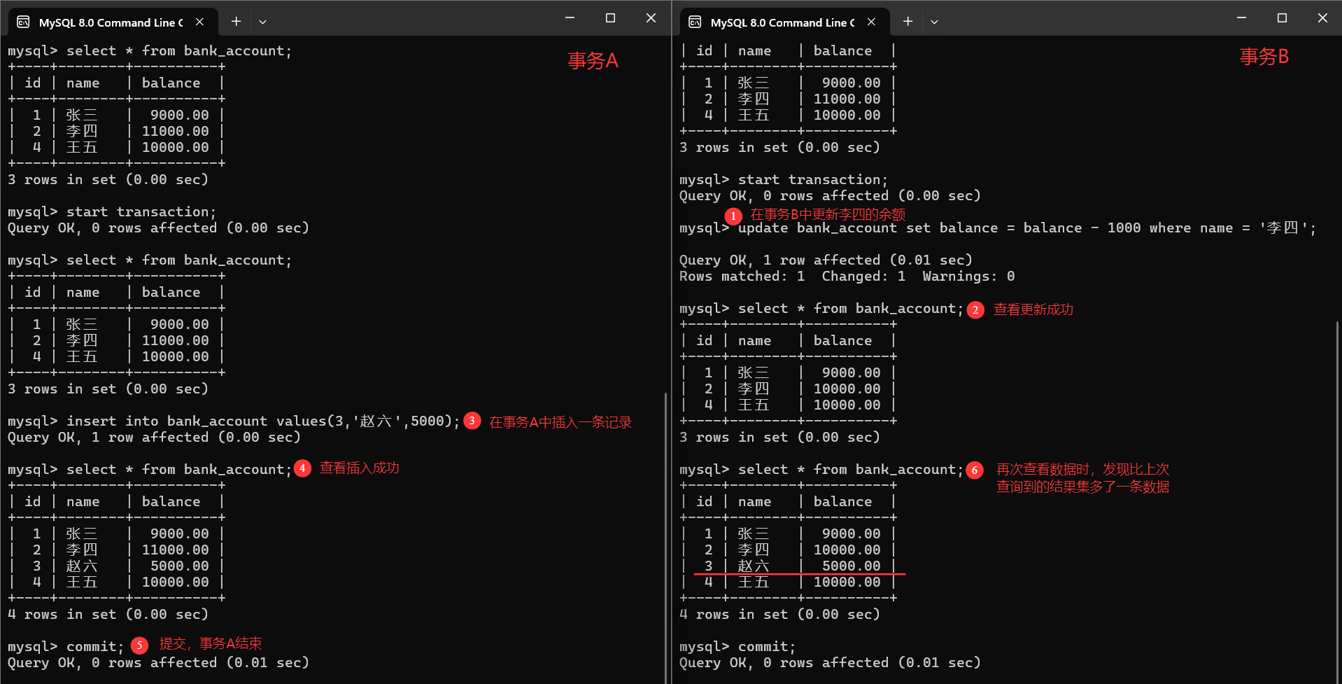 mysql> insert into bank_account(name, balance) values('李四',10000);