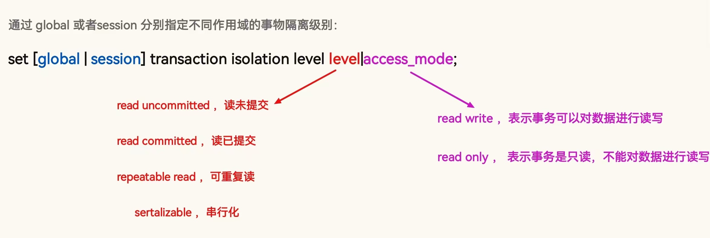 设置事务的隔离级别 level 和访问模式 access_mode,可以使用以下语法: