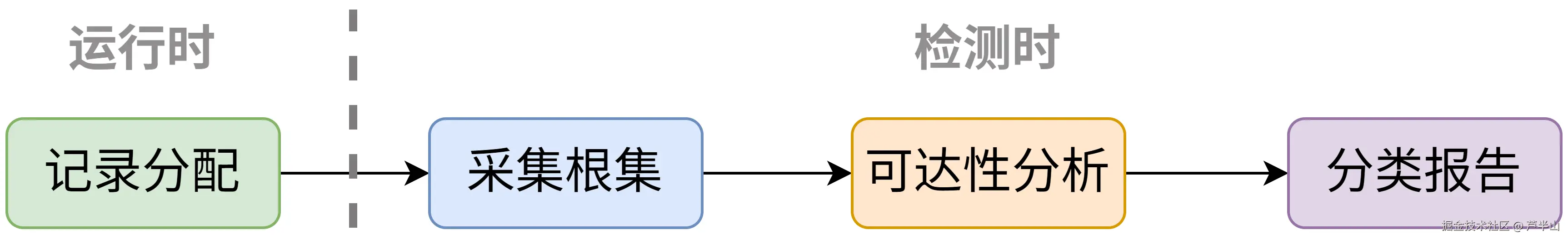 回到泄漏检测本身,它的工作分为两个时段:运行时和检测时。