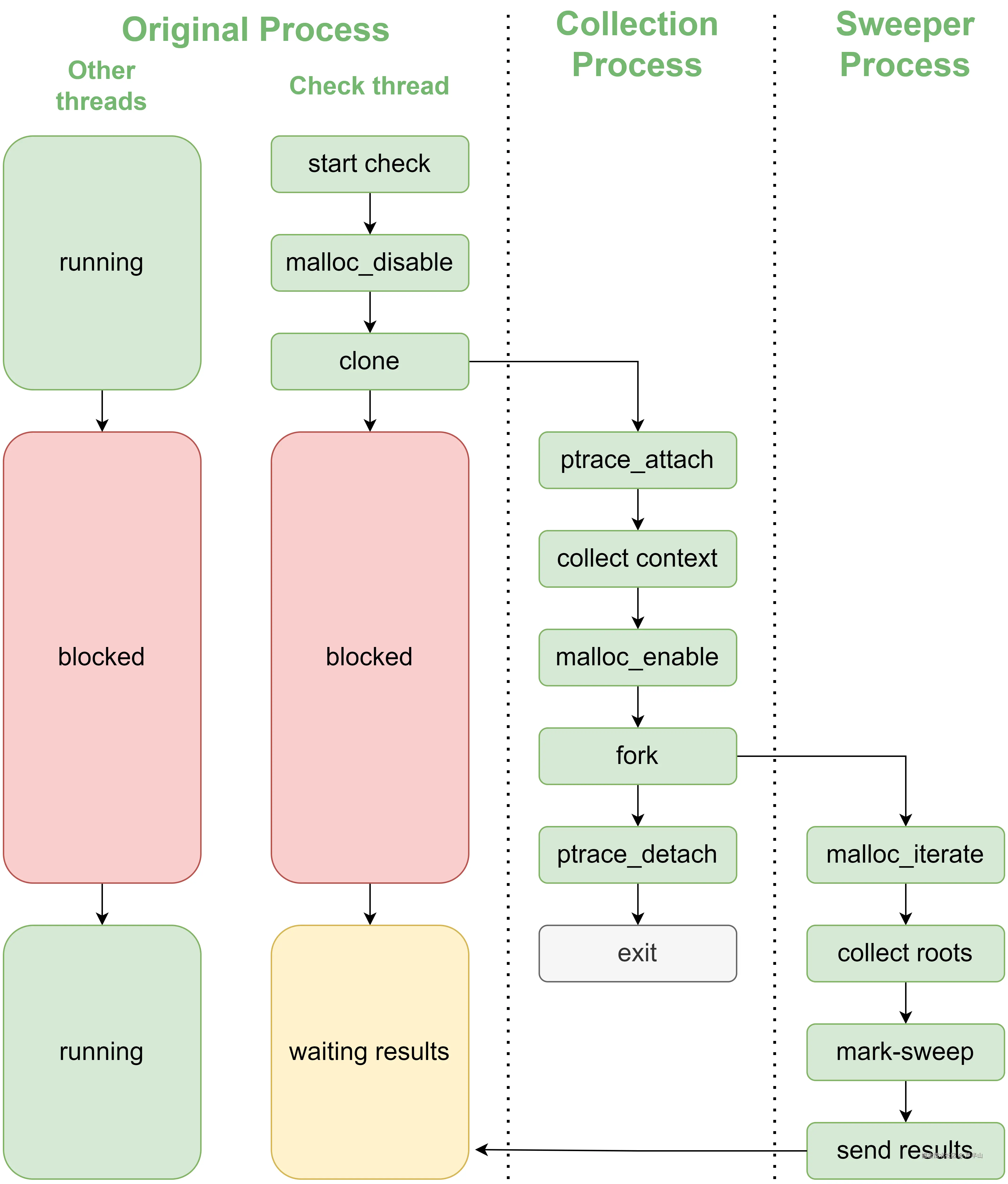 有人可能会好奇,为何collector进程采用clone的方式创建,而sweeper进程则采用fork。这是因为clone(CLONE_VM)会让子进程与父进程共享同一份地址空间,而fork会复制地址空间,导致的结果就是clone出来的子进程仍然可以观测到父进程对于内存的改动,而fork则不行。collector采用clone,可以保证ptrace真正暂停父进程之前的内存改动依然可以被观测到,从而保证最终内存的一致性。