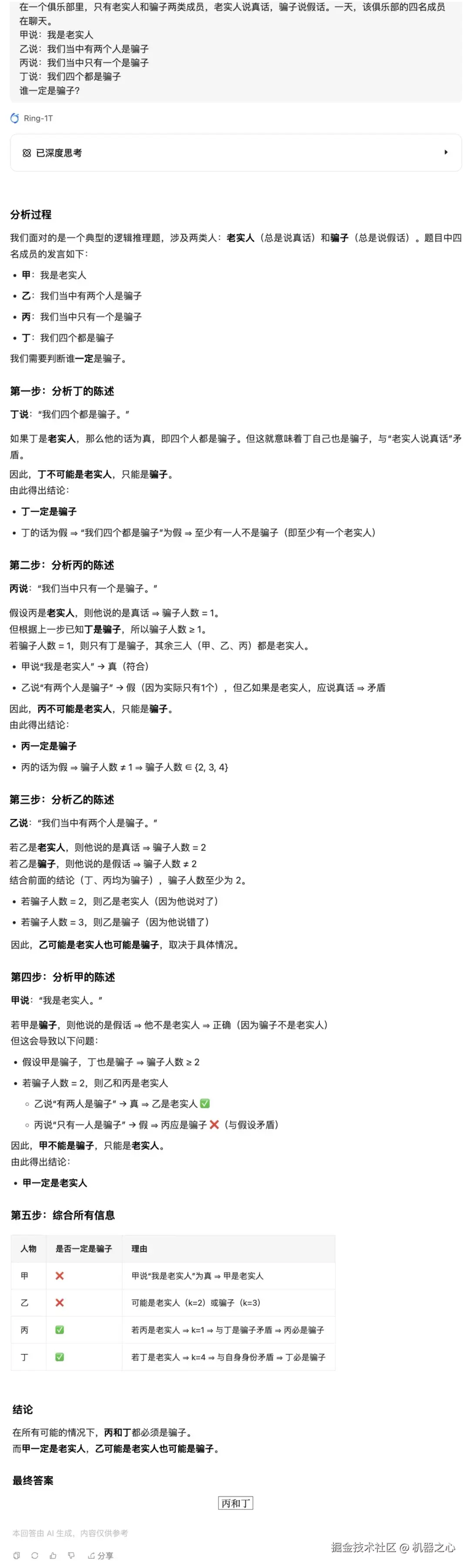 这道逻辑题曲里拐弯,Ring-1T 颇费了些工夫,逐一分析四名成员的发言,并以表格的形式梳理出所有信息,最终得出正确答案。