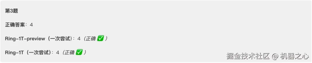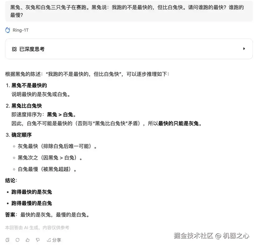 这道推理题目相对简单,Ring-1T 的回答也没费多大劲,梳理题干信息、给出答案、验证答案,一气呵成。
