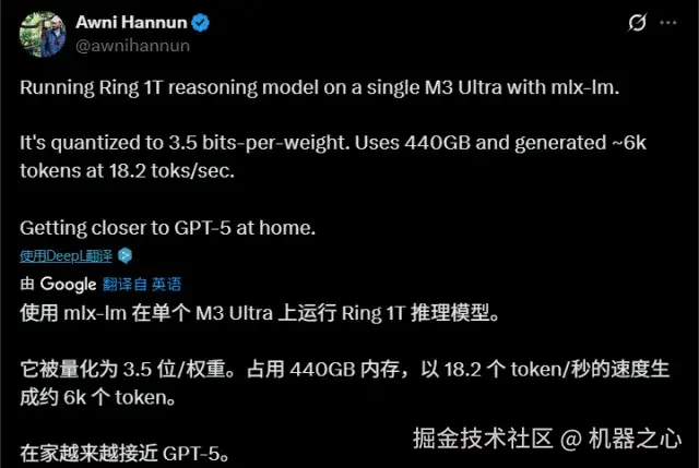 Ring-1T-preview刚出来,就有苹果工程师在自己的 M3 Ultra 上跑了起来。