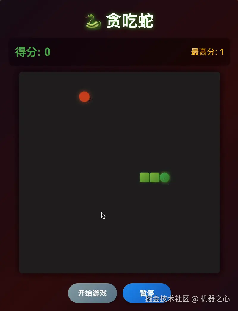 提示词:生成一个简单的贪吃蛇小游戏,要求包含以下功能:一个固定大小的网格,显示蛇和食物;蛇在网格上移动,玩家可以使用箭头键控制蛇的方向(上、下、左、右);每次蛇吃到食物后,蛇的长度增加,新的食物会出现在网格上的随机位置;当蛇撞到自己的身体或边界时,游戏结束,并显示最终得分;每吃到一块食物,分数增加,并显示当前分数;玩家可以开始和暂停游戏;蛇的移动应平滑,并显示蛇头和身体的不同部分;使用HTML、CSS和JavaScript实现游戏逻辑、动画效果,并确保游戏在桌面和移动设备上流畅运行。