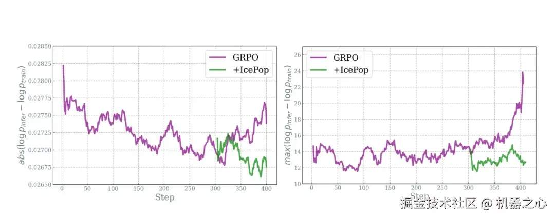 结果立竿见影。在长周期训练下,GRPO 的训推差异曲线一路飙升,而 IcePop 曲线稳定、峰值显著下降------仿佛给过热的系统喂了一根「棒冰」。