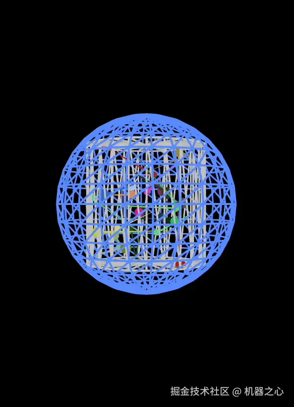 提示词:Write a p5.js script that simulates 25 particles in a vacuum space of a cylindrical container, bouncing within its boundaries. Use different colors for each ball and ensure they leave a trail showing their movement. Add a slow rotation of the container to give better view of what's going on in the scene. Make sure to create proper collision detection and physic rules to ensure particles remain in the container. Add an external spherical container. Add a slow zoom in and zoom out effect to the whole scene.