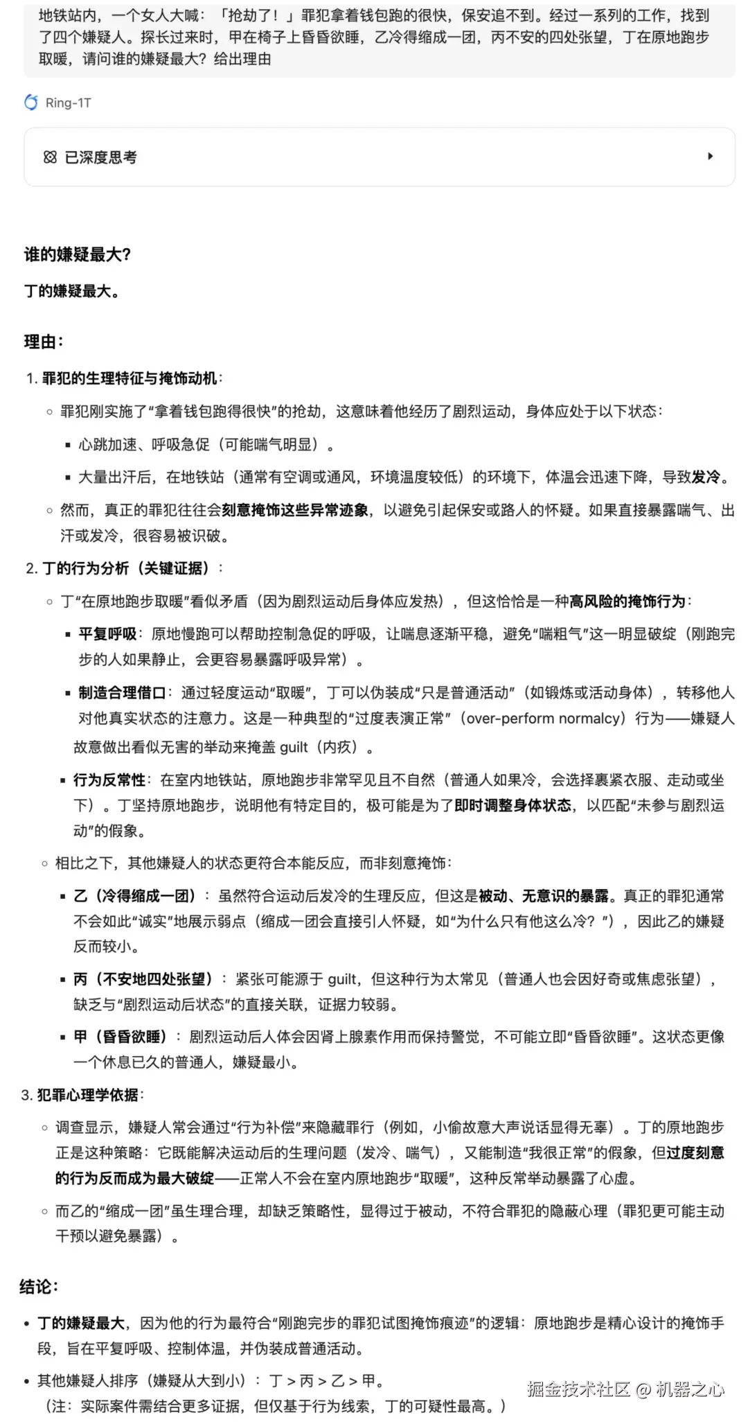Ring-1T准确识别出不同嫌疑人的行为与情境,并经过一系列推理,最终给出了正确答案。这种推理不仅依赖于对情境的理解,还考虑到了行为模式和心理状态的微妙差异。