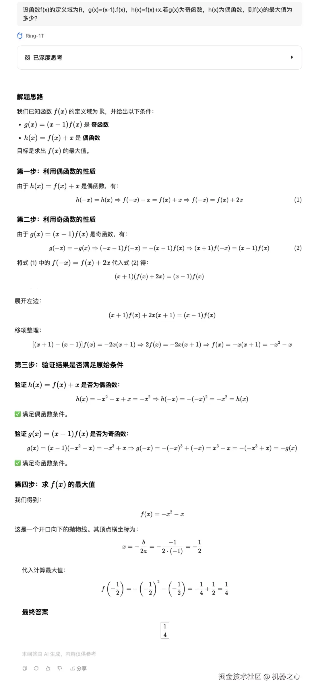 根据其思维链,我们发现 Ring-1T 思路非常清晰,先回顾奇函数和偶函数的定义,然后根据这两个条件列出方程,解出 f(x) 的表达式,最后准确求出最大值。