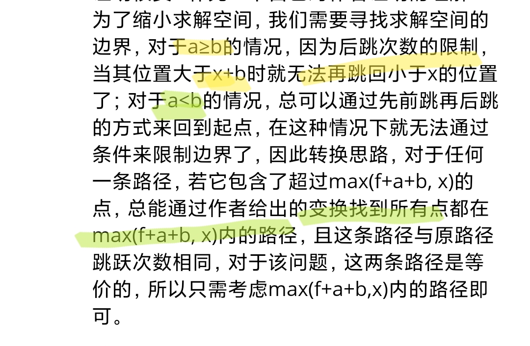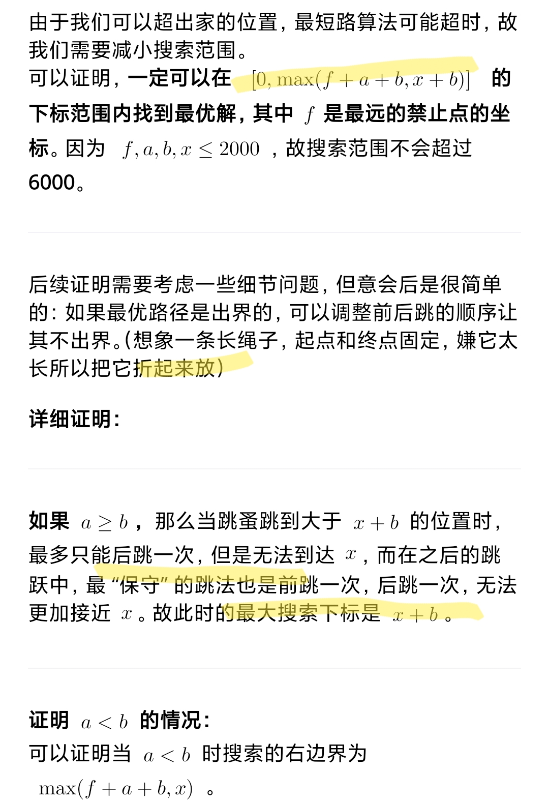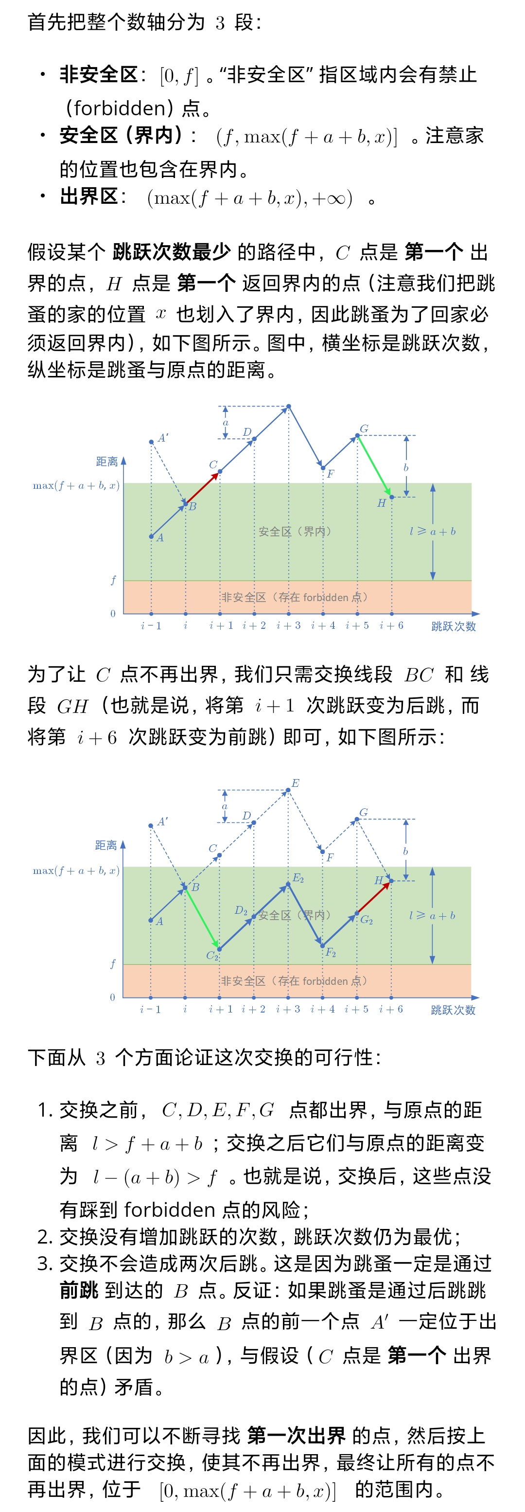 这样就能把所有点限制在 [0, max(f + a + b, x)] 范围内,保证找最少跳跃次数时不用考虑出界情况