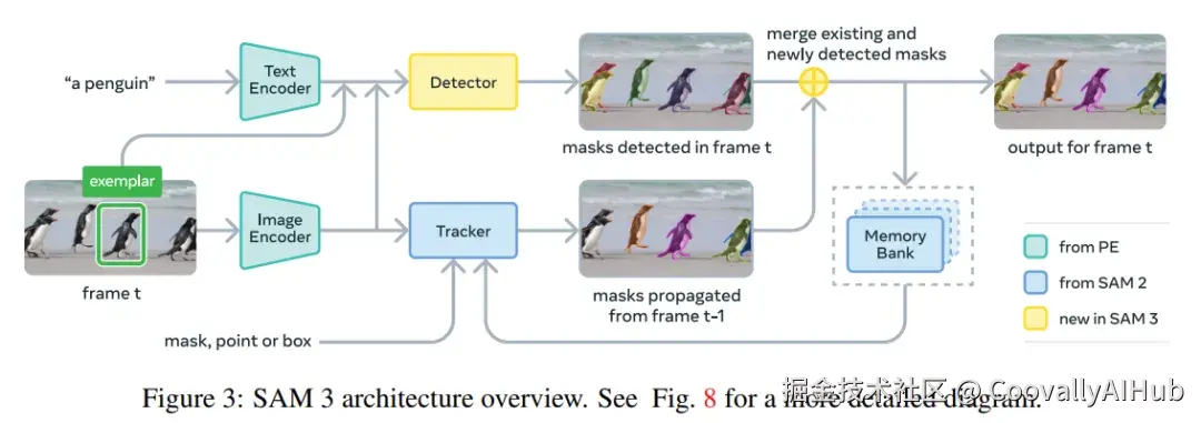 SAM 3的架构由一个检测器(Detector) 和一个追踪器(Tracker) 组成,二者共享一个强大的视觉主干网络(Perception Encoder)。