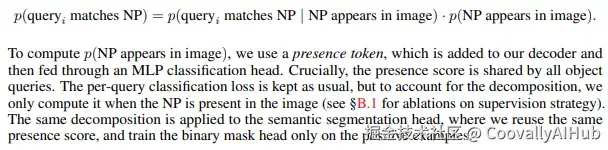 SAM 3引入了一个全局的Presence Token,专门用于预测"目标概念是否存在于画面中"。而每个检测框只需专注于解决"如果概念存在,我是不是其中一个实例的位置"这个更简单的定位问题。