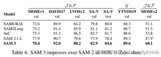 在视频分割上,SAM 3同样全面超越SAM 2,尤其在极具挑战性的MOSEv2数据集上,性能提升超过12个点。