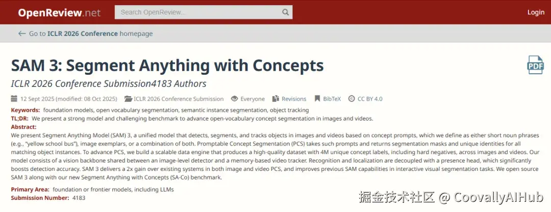 最近,在AI顶会ICLR 2026的Open Review阶段,一篇匿名提交的论文 《 SAM 3: Segment Anything with Concepts 》 引发网友广泛关注。
