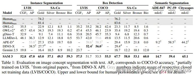 图像分割上,SAM 3在LVIS数据集上的零样本mask AP达到47.0,远超之前的SOTA模型。在其提出的SA-Co基准上,其CGF₁指标更是达到最强基线的2倍以上。