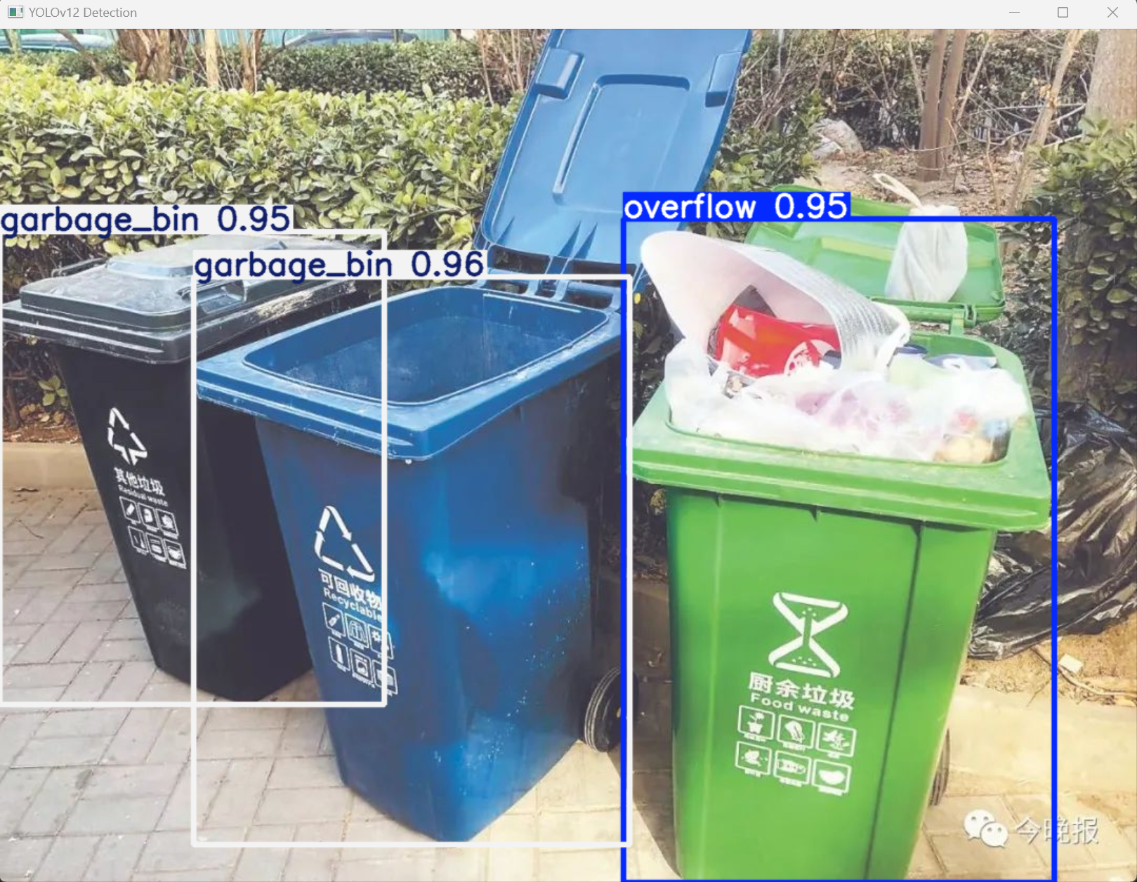 基于深度学习YOLOv12神经网络实现垃圾桶满溢检测和识别,其能识别检测出3种垃圾桶满溢:names: ['overflow', 'garbage', 'garbage_bin']