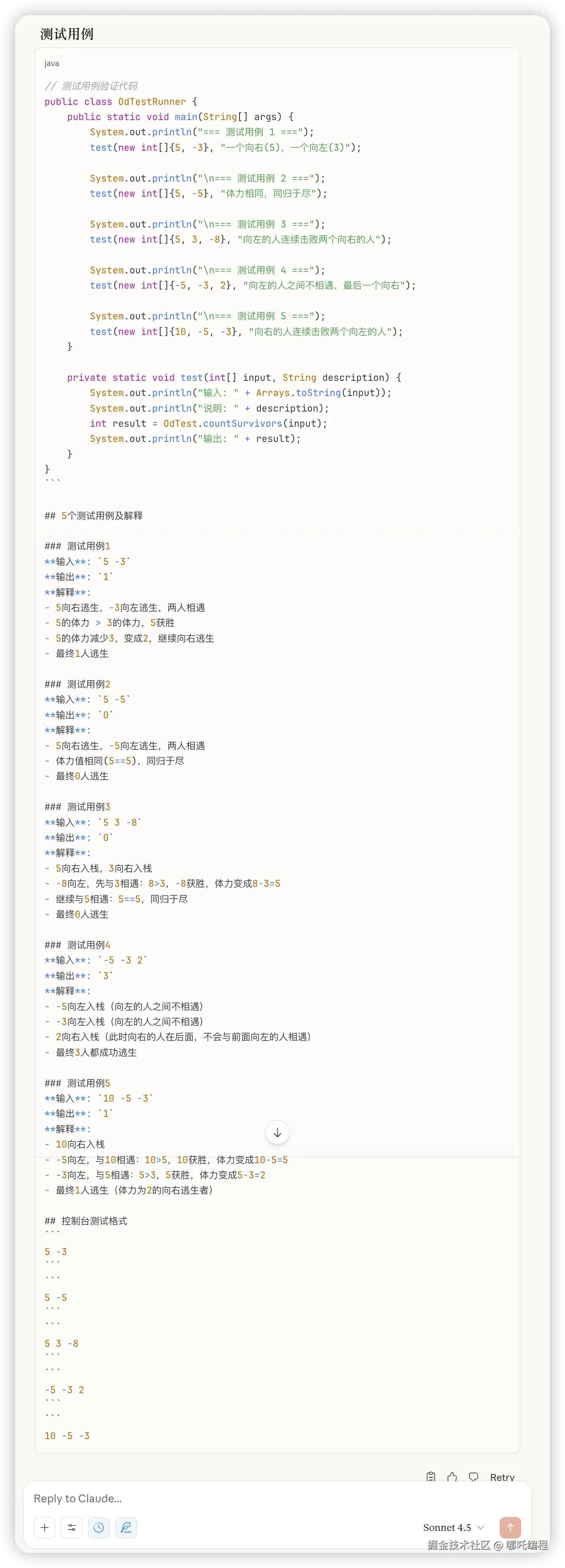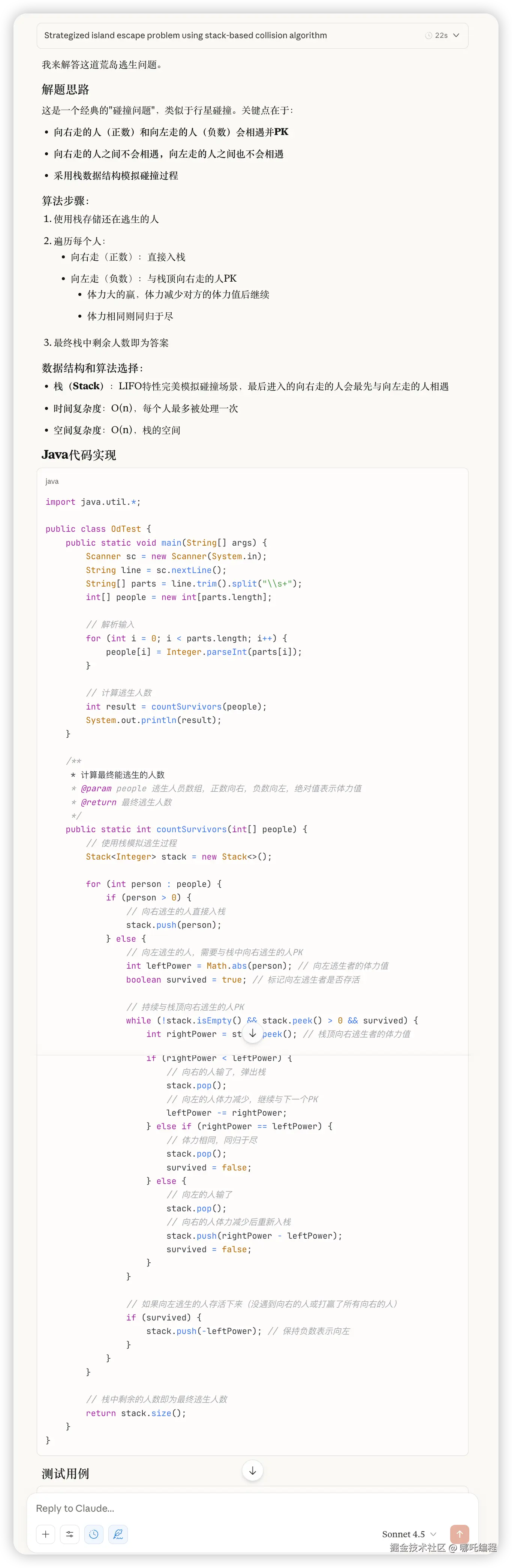 Claude Sonnet 4.5给出了解题思路与算法分析(包含问题本质、采用的数据结构和算法)、详细的Java 代码、详细的代码注释、测试用例及说明(不包含边界用例)。