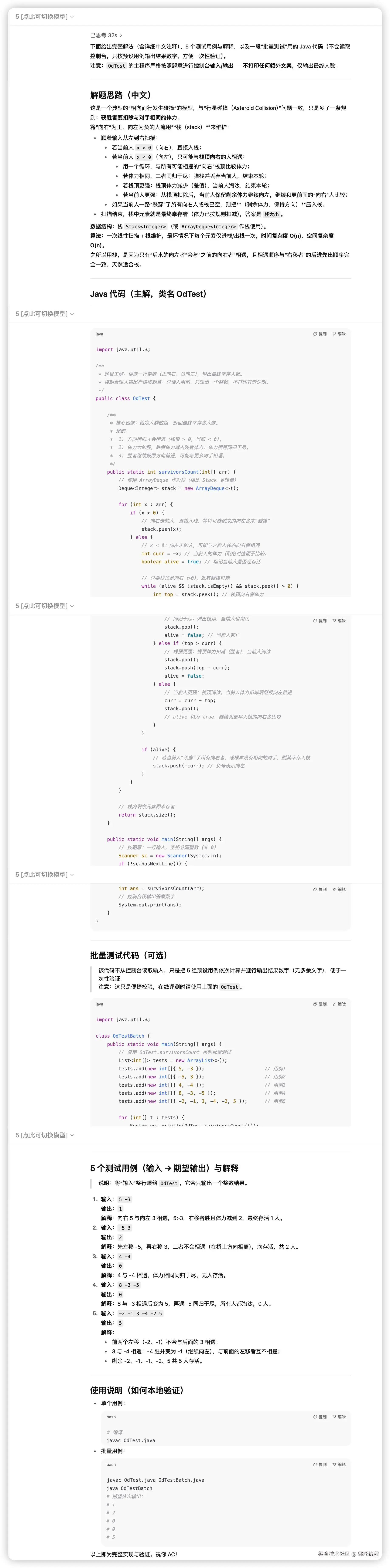 GPT-5给出了解题思路、算法步骤、详细的Java 代码、详细的代码注释、对Java代码进行自测、测试用例及说明(不包含边界用例)。