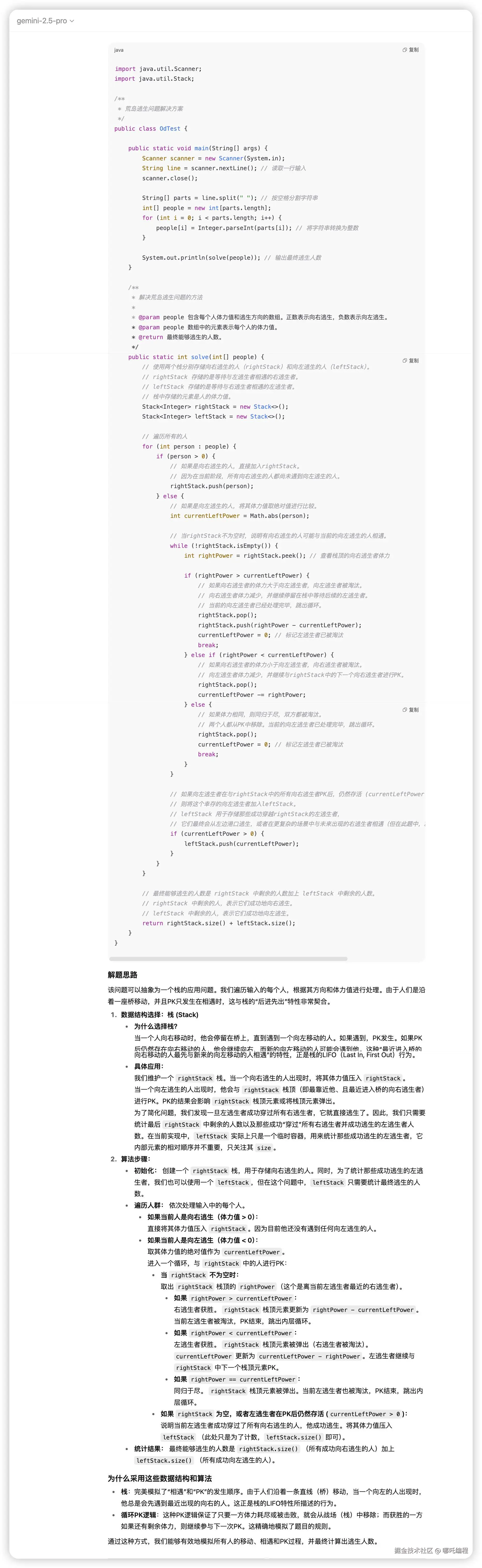 Gemini 2.5 Pro给出了解题思路与算法分析(包含问题本质、采用的数据结构和算法)、详细的Java 代码、详细的代码注释、测试用例及说明(不包含边界用例)。