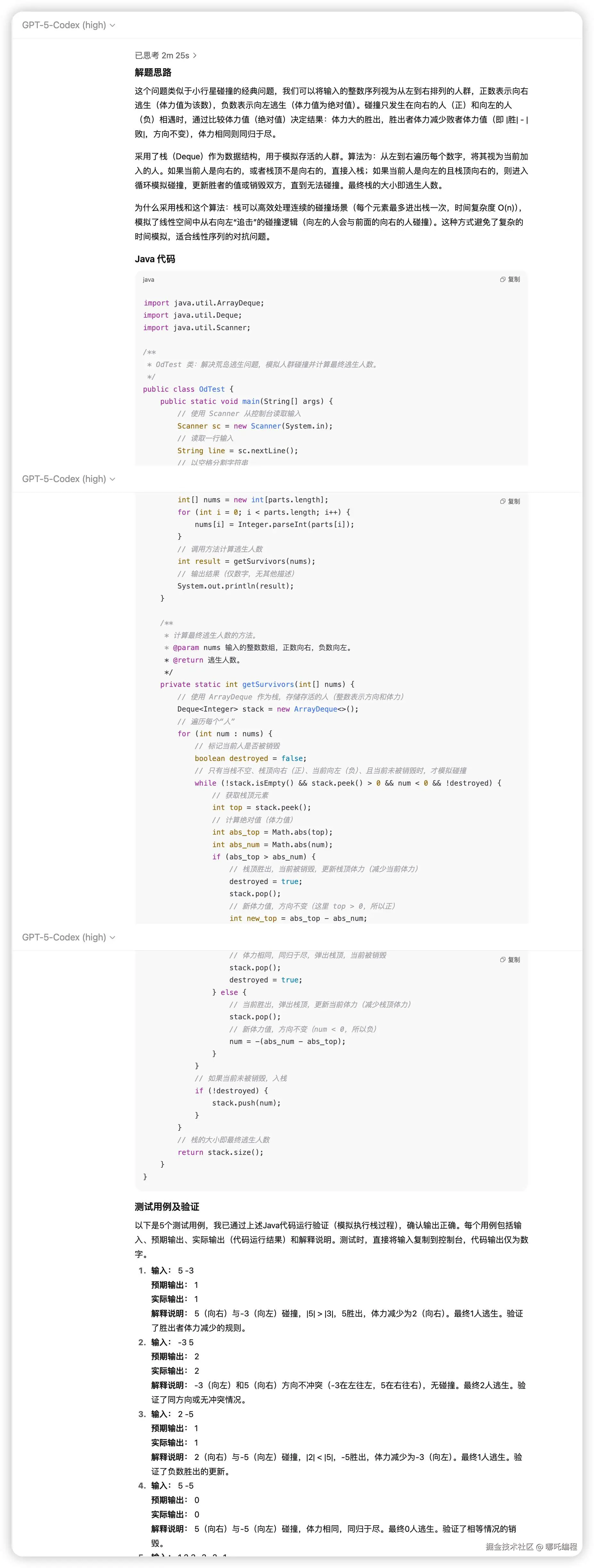 GPT-5 Codex给出了解题思路与算法分析(包含问题本质、采用的数据结构和算法)、详细的Java 代码、详细的代码注释、对Java代码进行自测、测试用例及说明(包含边界用例)。