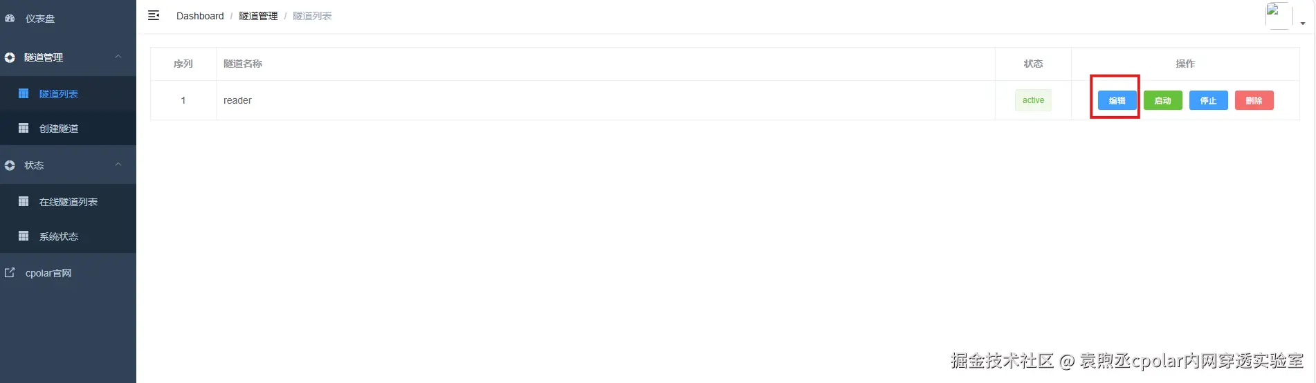 登录cpolar web UI管理界面,点击左侧仪表盘的隧道管理------隧道列表,找到所要配置的隧道reader,点击右侧的编辑