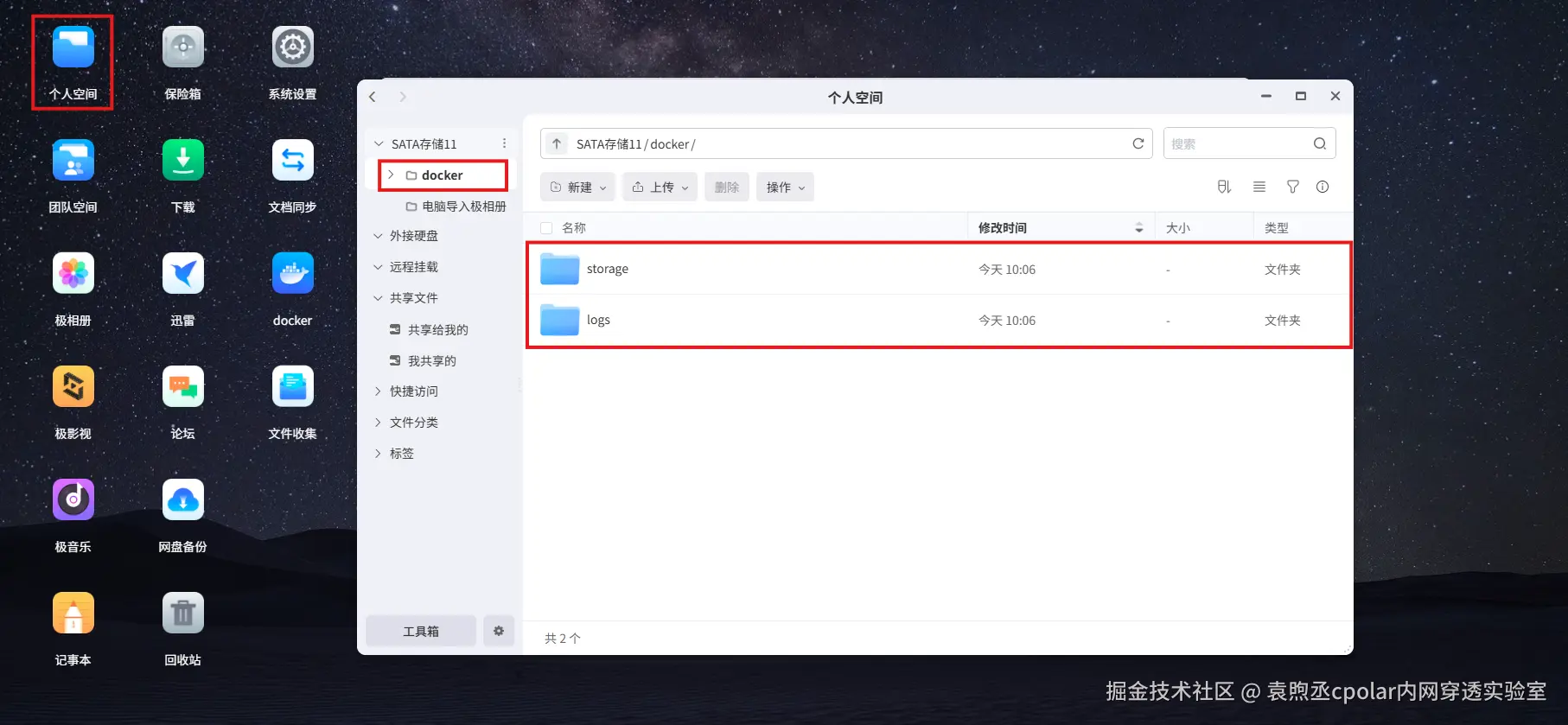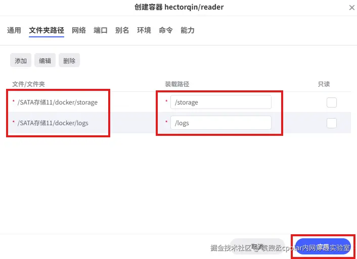 获得reader的镜像后,我们需要给这个应用创建2个文件夹,用来存储系统的数据和书籍的文件。我们在根目录下先创建一个docker文件夹;在Docker文件夹下添加一个logs文件夹和一个storage文件夹。