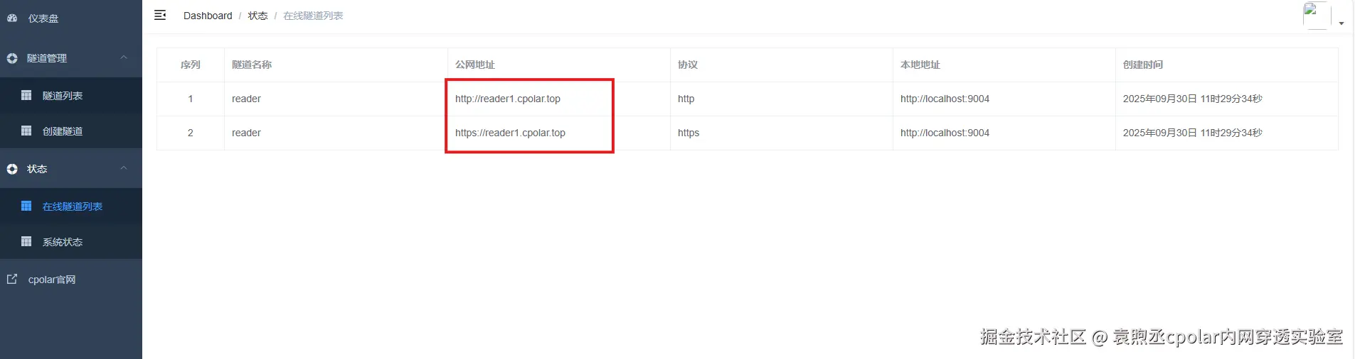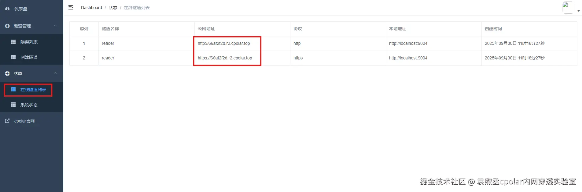 更新完成后,打开在线隧道列表,此时可以看到随机的公网地址已经发生变化,地址名称也变成了保留和固定的二级子域名名称。