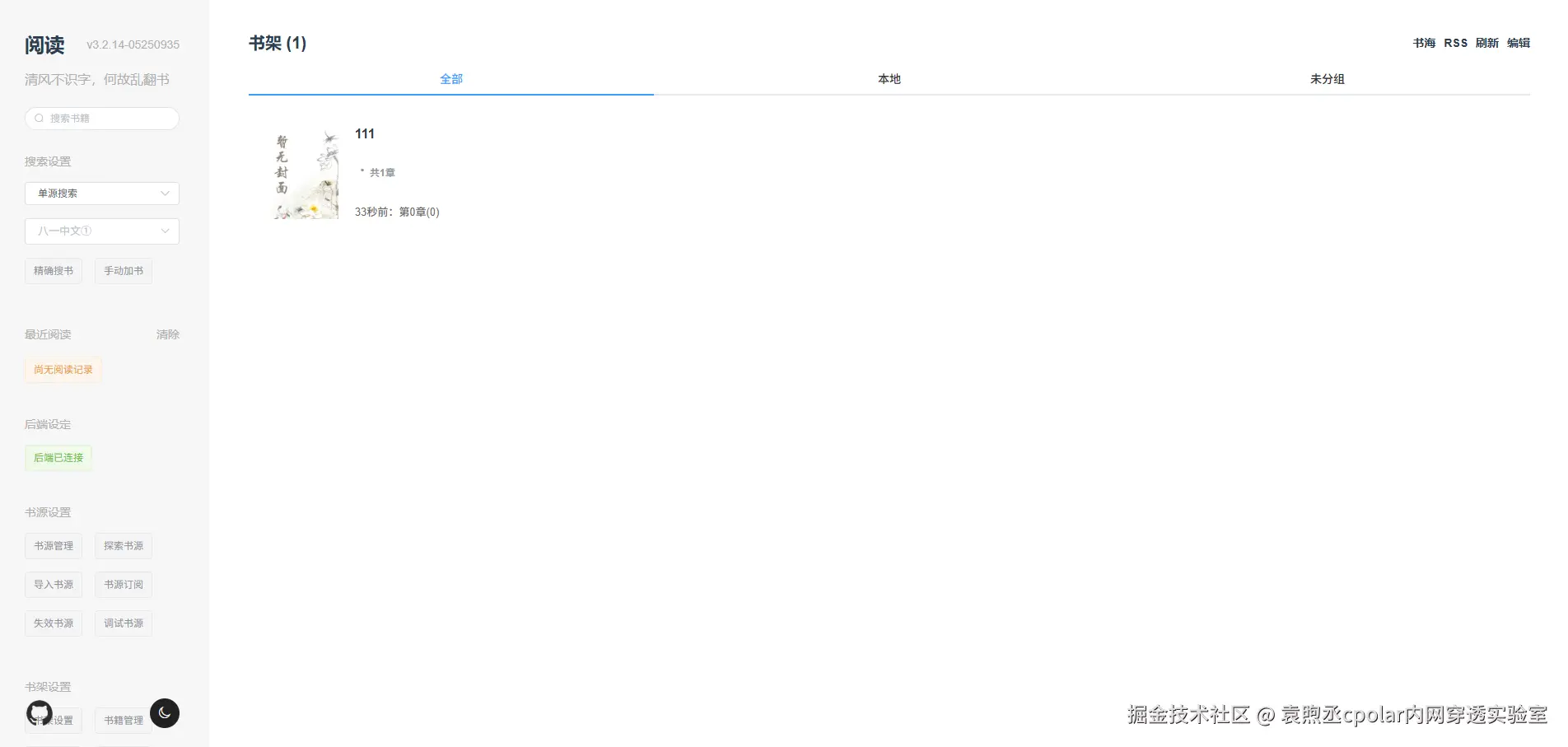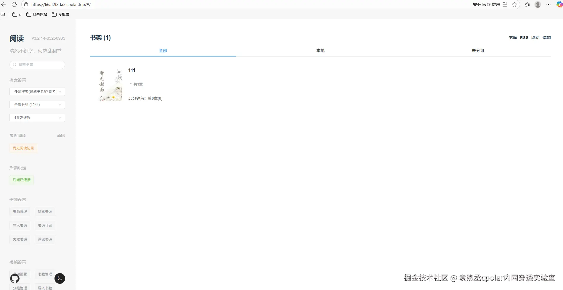 Reader是开源电子书管理工具,结合极空间私有云存储与索引能力,通过封面识别和智能分类让杂乱文件秒变知识库。搭配cpolar内网穿透技术,实现远程访问------从此告别"收藏即读完"的尴尬,把数字负债变成随时可用的智慧弹药库!