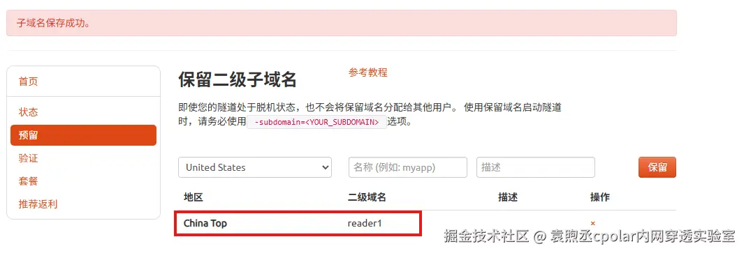 点击左侧的预留,选择保留二级子域名,地区选择china Top,然后设置一个二级子域名名称,我使用的是reader1,大家可以自定义。填写备注信息,点击保留。