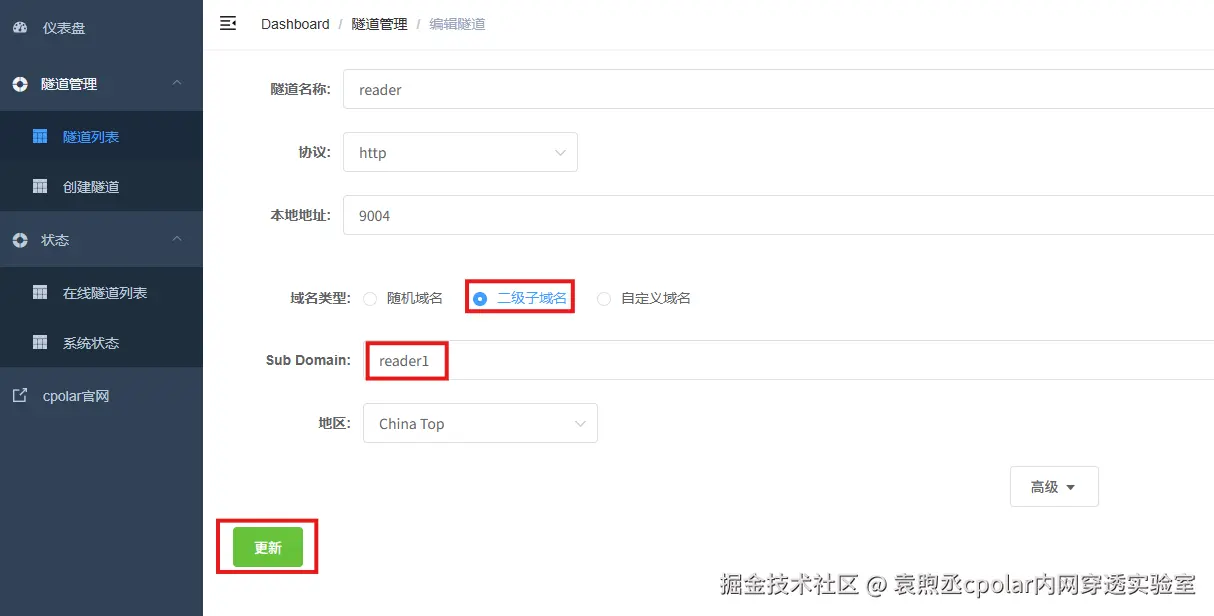 修改隧道信息,将保留成功的二级子域名配置到隧道中