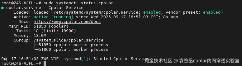 安装完成后,执行下方命令查看cpolar服务状态:(如图所示即为正常启动)