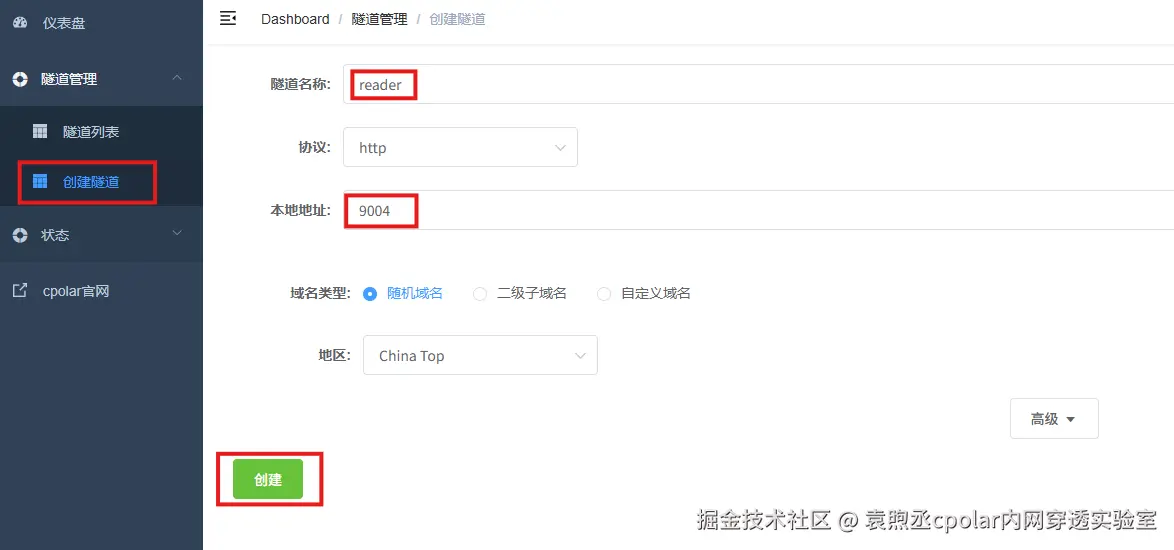 - 隧道名称:可自定义,本例使用了:reader,注意不要与已有的隧道名称重复