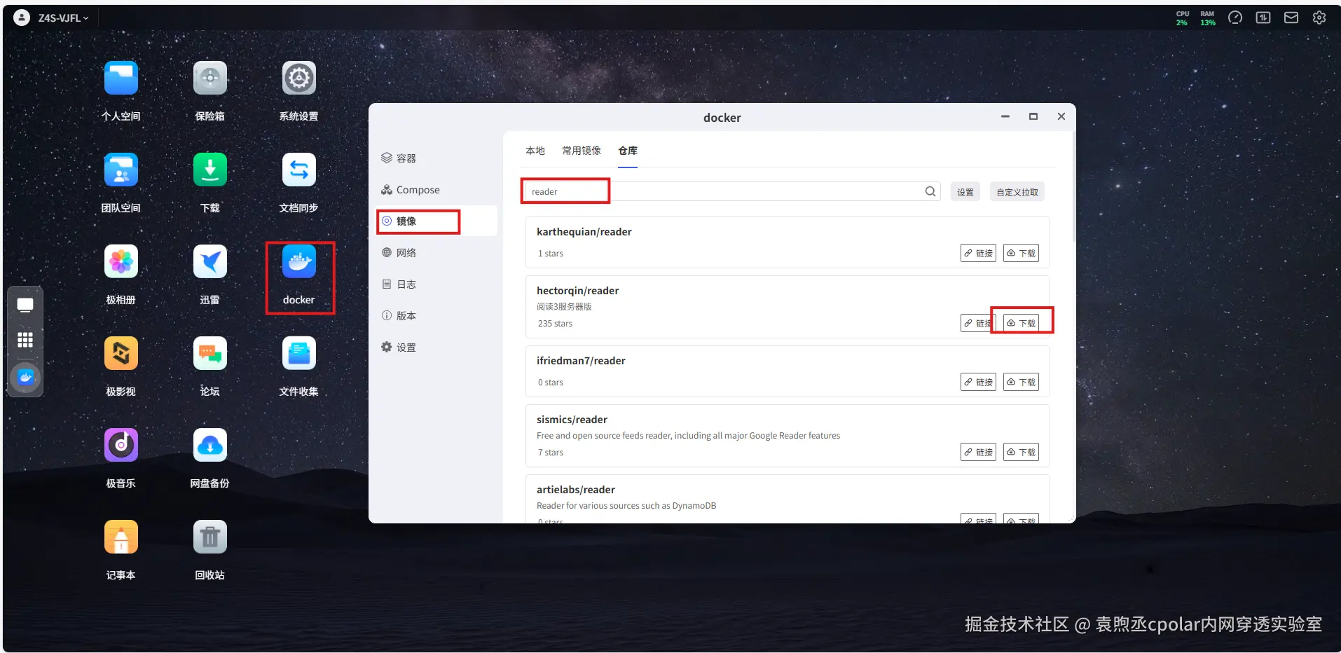 首先打开docker---镜像---仓库,搜索reader,下载hectorqin/reader这个镜像。