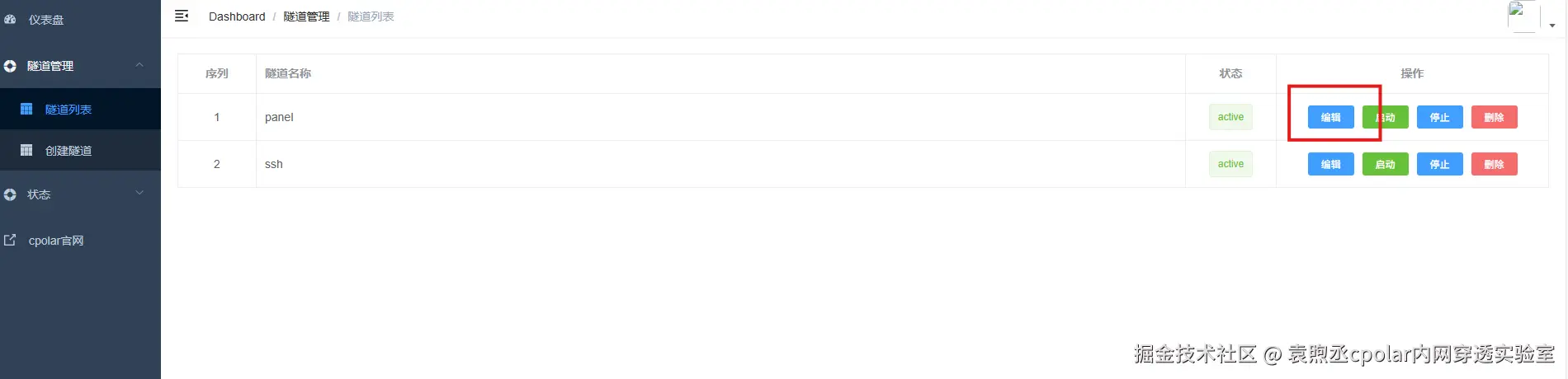 登录cpolar web UI管理界面,点击左侧仪表盘的隧道管理------隧道列表,找到所要配置的隧道panel,点击右侧的编辑