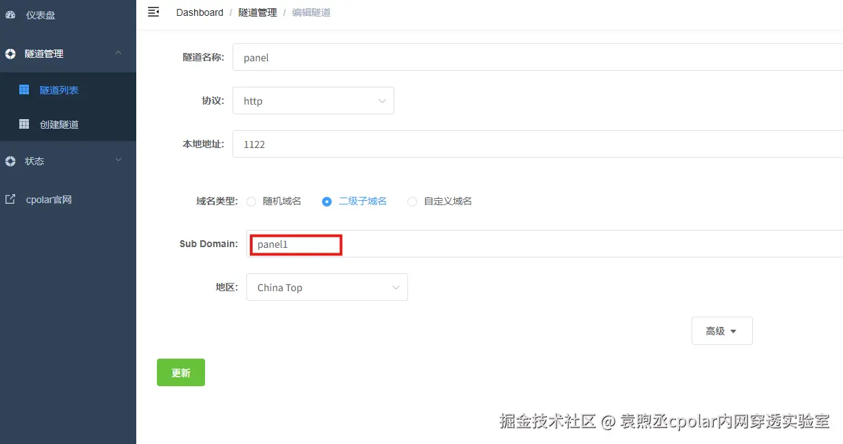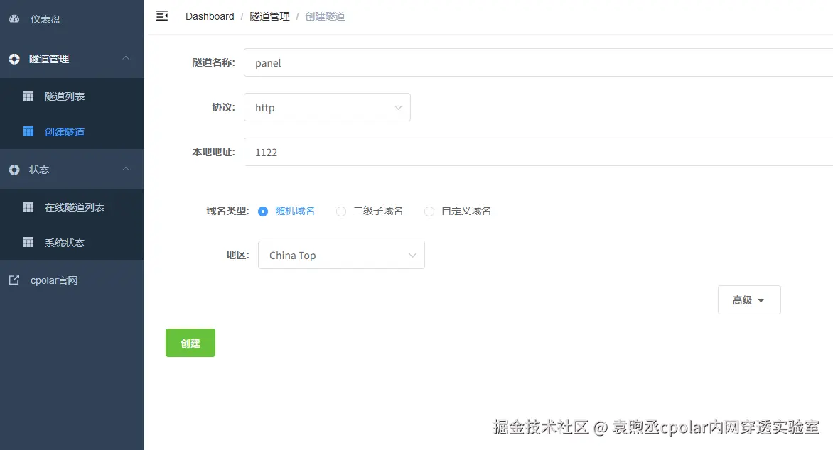 - 隧道名称:可自定义,本例使用了:panel,注意不要与已有的隧道名称重复