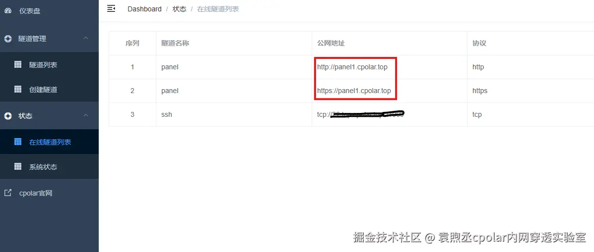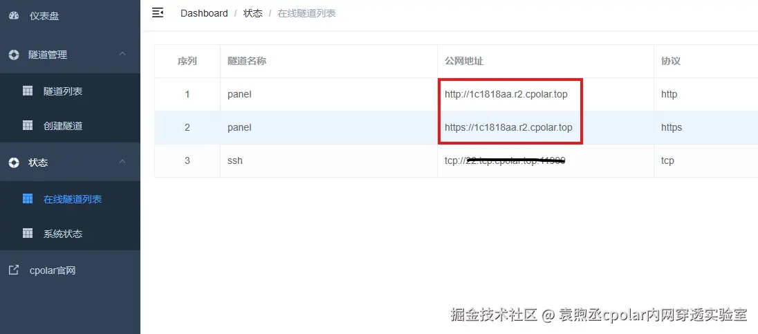 创建成功后,打开左侧在线隧道列表,可以看到刚刚通过创建隧道生成了公网地址,接下来就可以在其他电脑或者移动端设备(异地)上,使用地址访问。