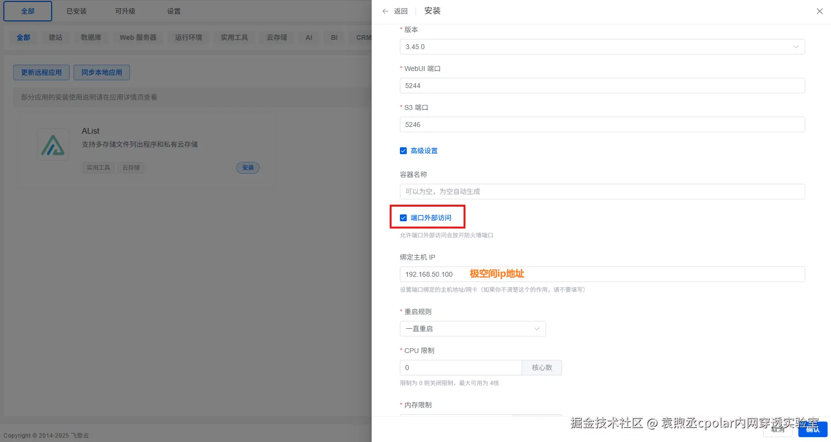 端口外部访问设为允许,端口填写的是极空间IP地址: