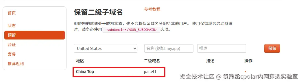 点击左侧的预留,选择保留二级子域名,地区选择china Top,然后设置一个二级子域名名称,我使用的是panel1,大家可以自定义。填写备注信息,点击保留。