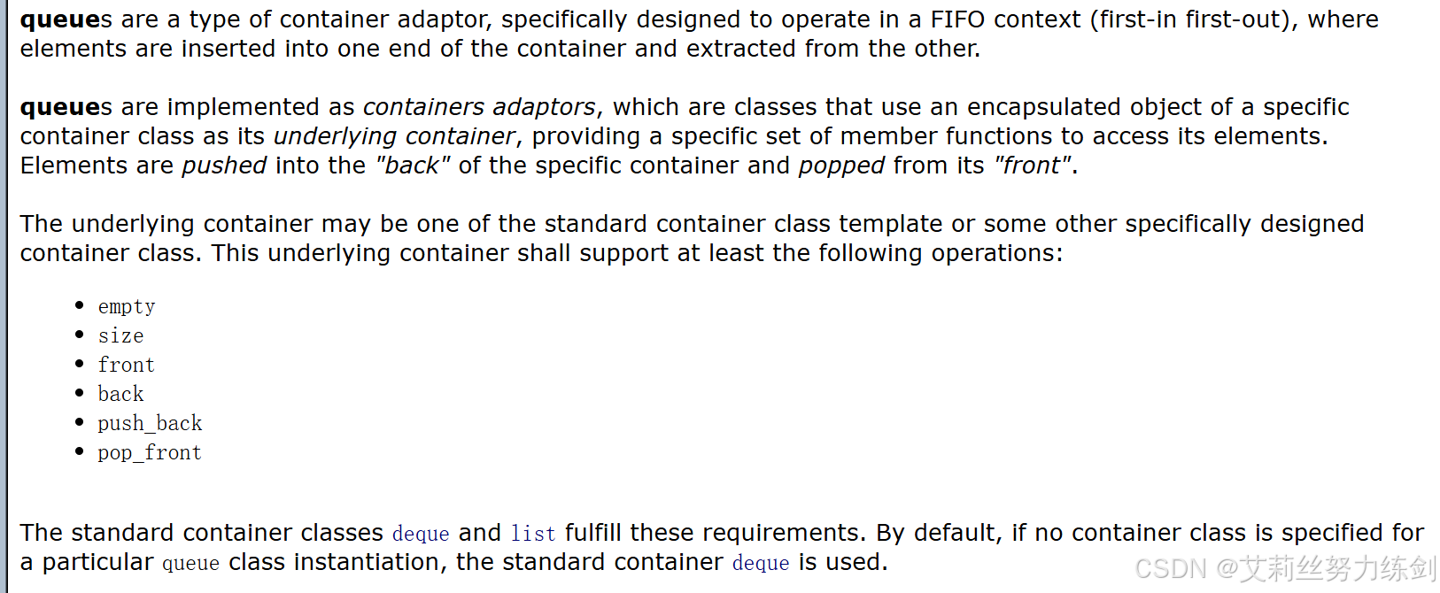 4、标准容器类deque和list满足了这些要求。默认情况下,如果没有为queue实例化指定容器