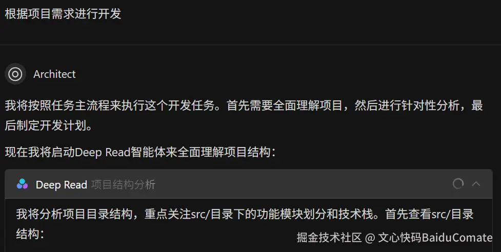 之前Comate我使用Zulu智能体比较多,新版Comate新增了Architect智能体,它基于SubAgent架构,内置Deep Read(深度阅读) + Actor(执行智能体),能更好拆解复杂问题并分工、编排,完成大型项目交付,这次我选择Architect进行开发。