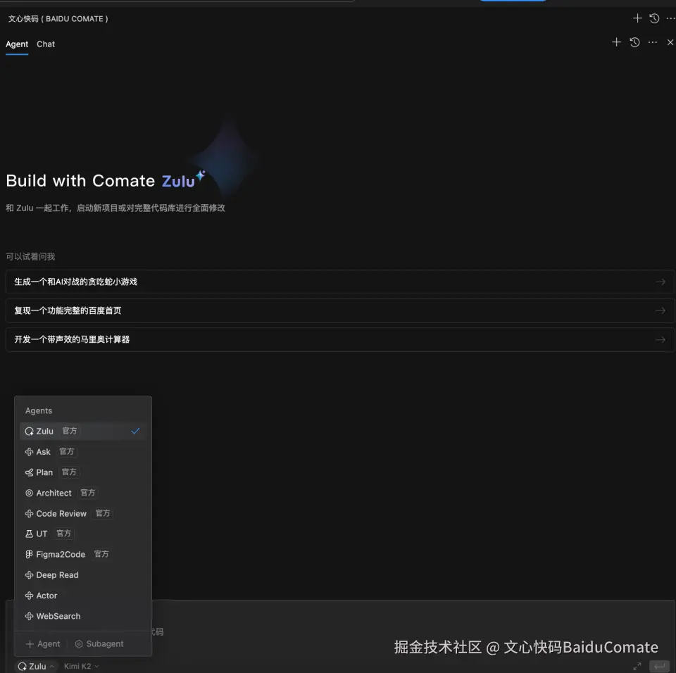 2025年6月23日,百度发布独立的AI IDE------百度文心快码Comate,我就第一时间上手体验了,最近Comate升级到3.5S版本,支持模型包括Kimi K2、Kimi K2 0905、GLM-4.6、DeepSeek-V3.2-Exp等,并且强化了多智能体自协同能力。
