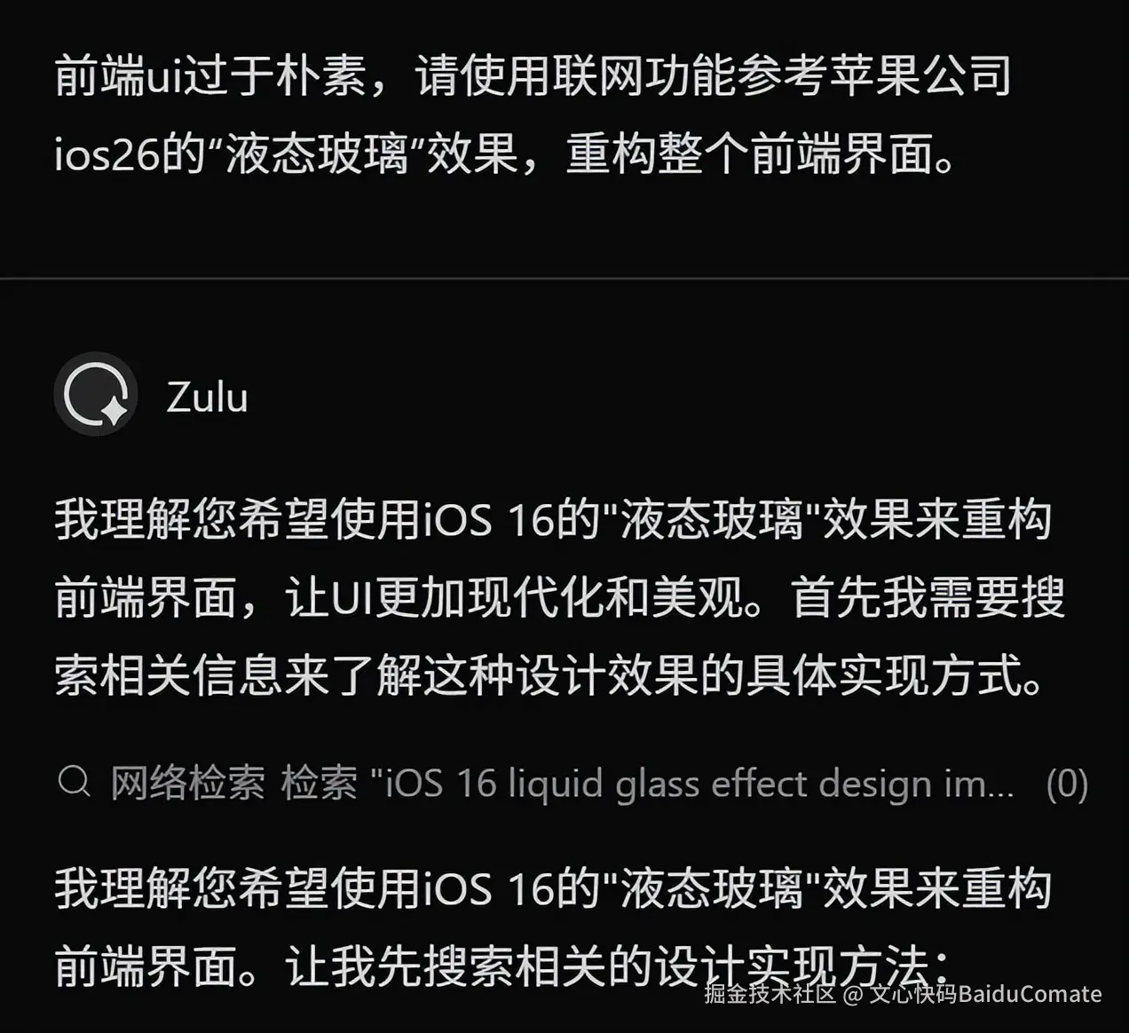 不过作为MVP版本,我选择更简单的方式,Zulu内置联网功能,我直接让其搜索并模仿苹果IOS26的"液态玻璃"效果,对界面进行优化。