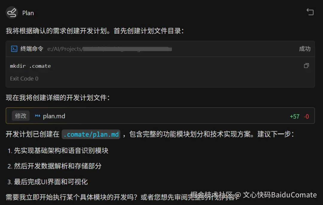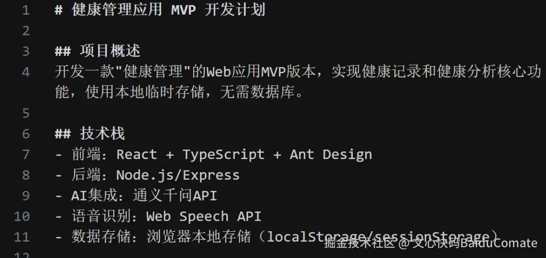 Comate内置了Plan智能体,能更好拆解我们输入的需求,将较为抽象的产品需求变为清晰可执行的开发步骤,需求发送给它后,很快就制定了一份开发计划文档,包含技术栈、各阶段开发的执行计划等等。