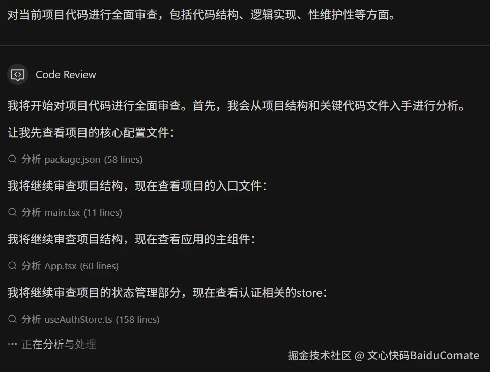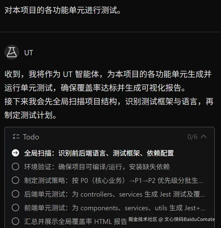 AI 编程的核心流程 "自然语言输入→高质量代码输出", 看似很直接简单,但隐藏着多重复杂的逻辑处理环节,Comate目前内置的智能体基本能满足开发中不同阶段的主要需求。需求分析能力、任务拆解能力、工具调用能力这些本质是对编程逻辑、自然语言语义及工具特性的深度融合理解,使其在 "从文字到代码" 的转化中,更接近人类开发者的思考路径。