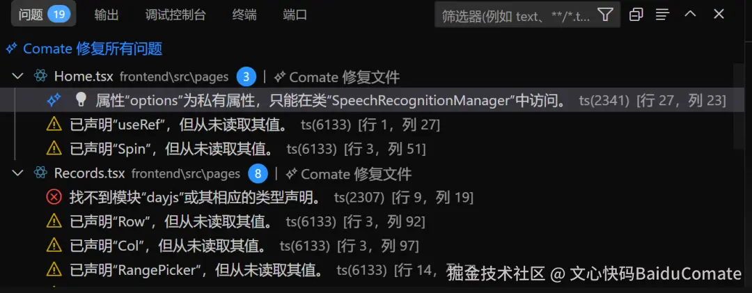 过程中出现报错也没关系,Comate支持直接读取终端报错信息,自动进行Bug修复。同时也可以在问题界面,一键点击修复所有问题。