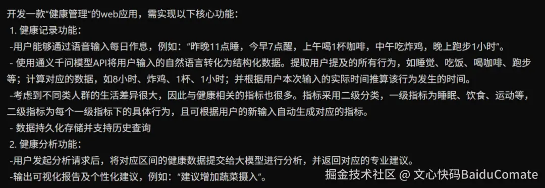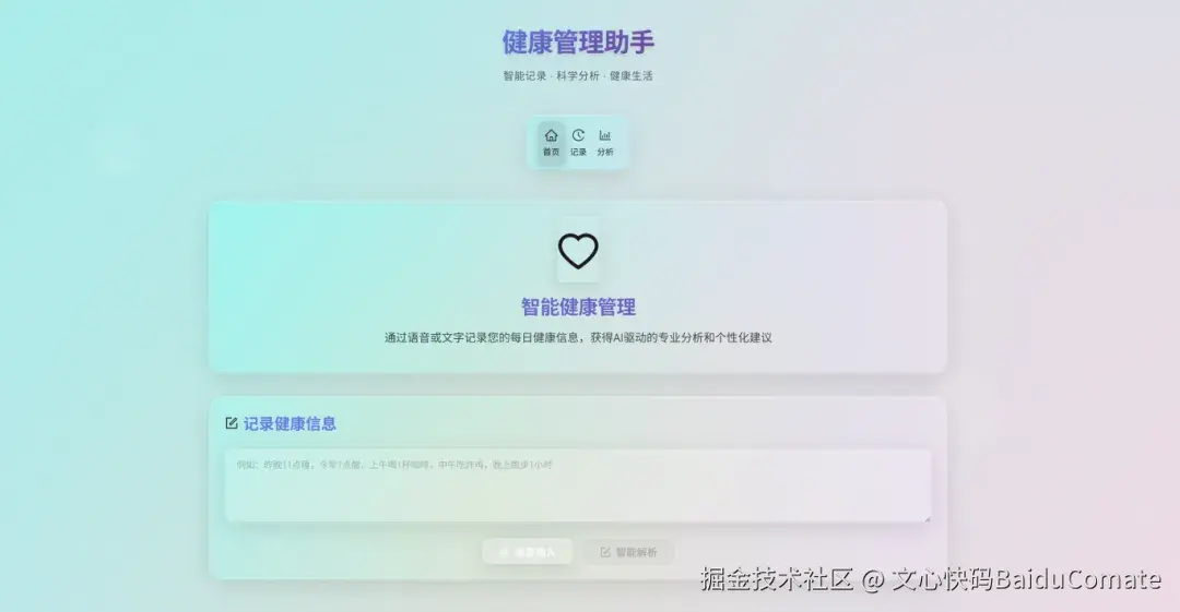 从原来的由Zulu编程智能体作为核心,实现「需求-编码-调试-验证」的端到端生成,到现在的内置Zulu、Plan、UT、F2C、Architect等 不同能力特长的智能体实现开发协同。实测体验下来,在项目中尤为显著。尝试开发了一个AI健康记录应用,实测体验下来:Comate在产品开发的整体工程能力实现上有显著提升