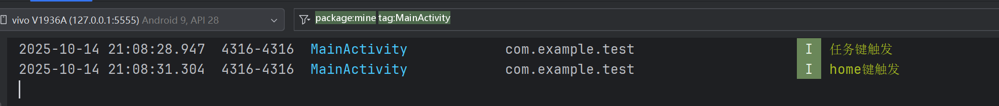 运行代码后,点击home和任务键,可以看到日志打印如下