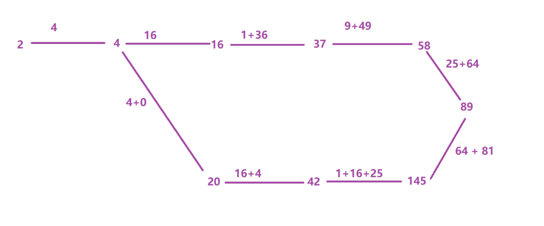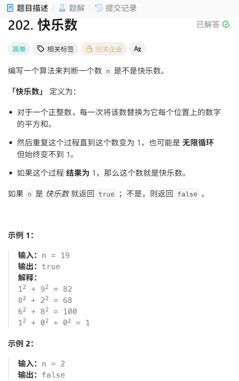 对于一个数,经过快乐数的定义变换后,是一定会成环的(这个可以用鸽巢定理证明感兴趣的同学可以搜搜看),并且题目中也给了提示,若没有提示,我们也可以自己证明